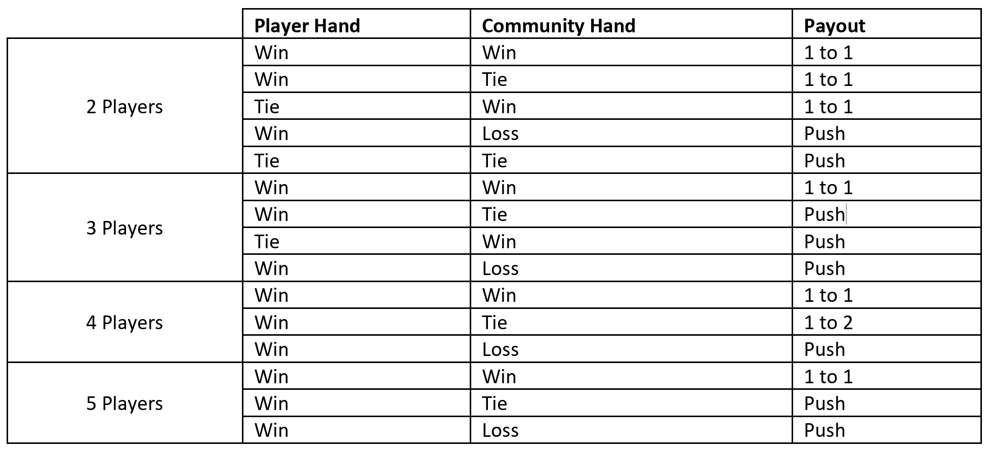 When determining the winner in a multiplayer game, the value of the player’s hand and the community hand are separately compared to the value of the dealer’s hand. Winning hands and payoffs depend on the number of players, as follows: