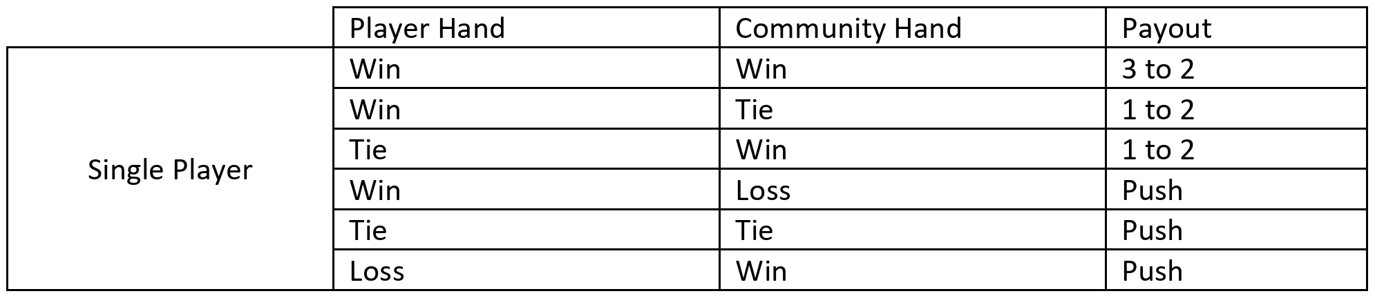 When determining the winner in a single player game, the value of the player’s 2-card hand and their 1card “community hand” are separately compared to the value of the dealer’s hand. Winning hands and payoffs are as shown here:
